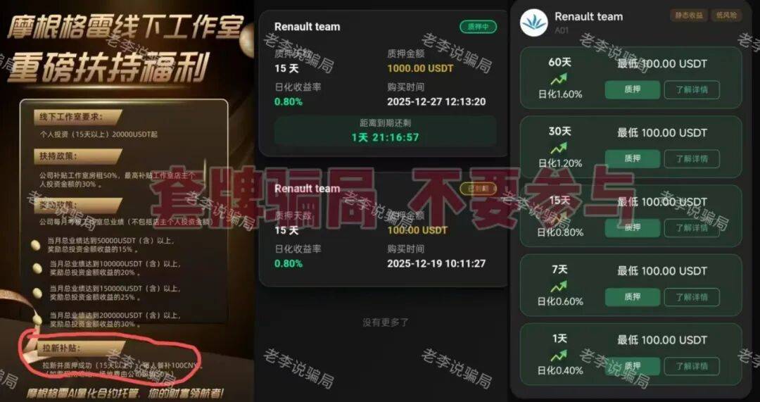 同时,平台要求投资者通过USDT私下转账入金,再以“拉新100%奖励、团队业绩阶梯返利、线下工作室房租补贴”等方式拉人头组建团队,全是拉人头的经典套路。